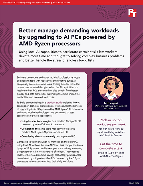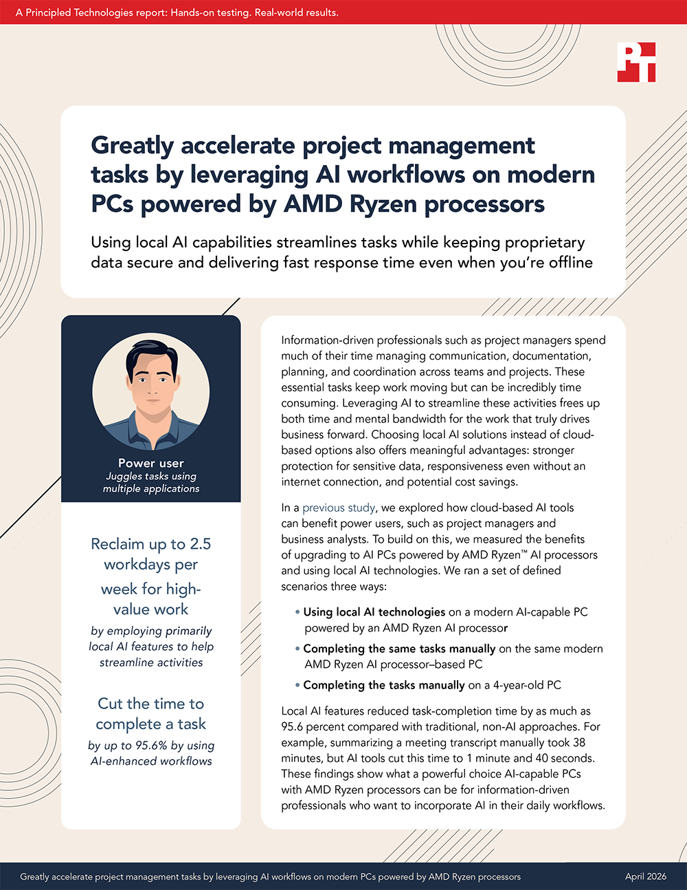 SANTA CLARA, CA, UNITED STATES, April 2, 2026 /EINPresswire.com/ -- Principled Technologies has released two new reports demonstrating that using AI tools on a modern PC powered by AMD Ryzen AI processors can significantly accelerate routine project-management and development tasks compared to using traditional workflows on a 4-year-old PC. When professionals can leverage AI to complete certain tasks more quickly, they can redirect the time they save to higher-value work and innovation. Because the AI tools that PT tested primarily ran locally instead of in the cloud, professionals could save time while also better protecting sensitive data, enjoying quicker response times, and being able to work without an internet connection.The report focusing on activities performed by developers stated: “In our testing, using local AI tools on a new HP EliteBook X G2a AI PC powered by an AMD Ryzen AI processor reduced task completion times by as much as 97.5 percent compared to completing the same tasks manually on a 4-year-old HP EliteBook 865 16 inch G9 Notebook PC. Based on our estimates of how frequently these tasks typically occur, we found that using AI tools on the newer system could lower weekly development-related work time from an average of 24 hours and 6 minutes to approximately 6 hours and 13 minutes. This represents a reduction of almost 18 hours of work per week—equivalent to over two standard workdays.”